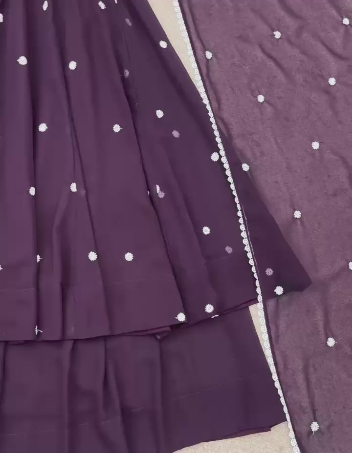 Top: Faux Georgette with heavy embroidery work, full sleeves, inner lining in soft micro cotton, with a stunning 5-meter flair (length: 40–42 inches).